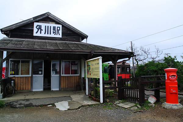 銚子電鉄の外川駅でNHKの澪つくしのロケに使われたもので木造の駅舎です。 駅前には雰囲気を壊さないように昔のタイプの郵便ポストが置かれています。