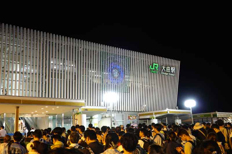 大曲の花火が終った後は駅の入場制限で多くの人が並んでいます。駅の花火も灯っていますね。