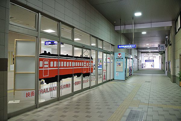 駅の入り口には映画のCMがあります。 ガラスの扉の向こうが改札になっていて、駅の入り口とは雰囲気が違います。