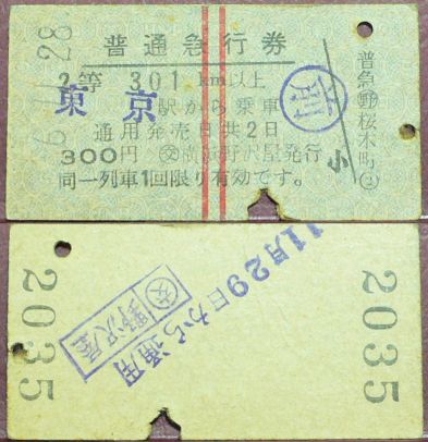 昭和36年11月28日発行の東京から301km以上の急行券で、乗車日は11月29日からとなっています。 桜木町駅ではなく野沢屋発行です。 また、前売りを意味すると思われる(前)の文字スタンプが押されています。
