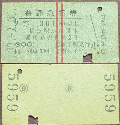 昭和37年1月30日の横浜から301km以上の急行券で2等です。 たての赤い2本線は2等を表す? 番号は5959のぞろ目?