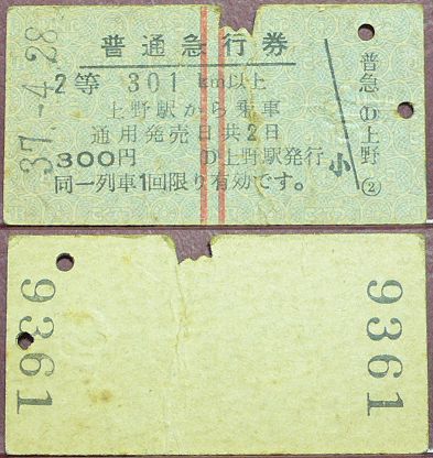 昭和37年4月28日の上野からの急行券です。 たての赤い2本線の意味は(?)ですが、2等の2を示しているのでしょうか?