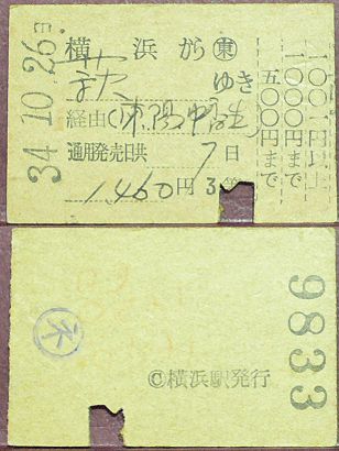 昭和34年10月26日の横浜から山口県萩までの乗車券で横浜駅で発券されたものです。9月27日の乗車券とほぼ同じですが、金額が微妙に違います。 経由地の違いだと思うのですが。