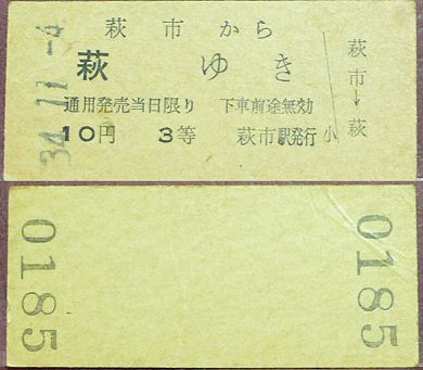 昭和34年11月4日の萩市から萩への乗車券です。 10円という金額からも短距離です。色はもっと赤みを帯びています。