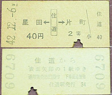 昭和42年12月6日の乗車券で両方向の駅名が書かれているものです。 高さの低いスリムタイプで色はもう少し赤っぽいです。