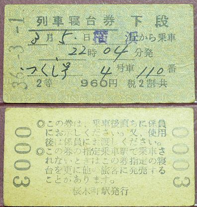 昭和36年3月1日の横浜からの寝台券です。 桜木町発行で番号が0003番でおしいです(0001だったら...)2等なので上級グレードですか? 税2割とありますし。