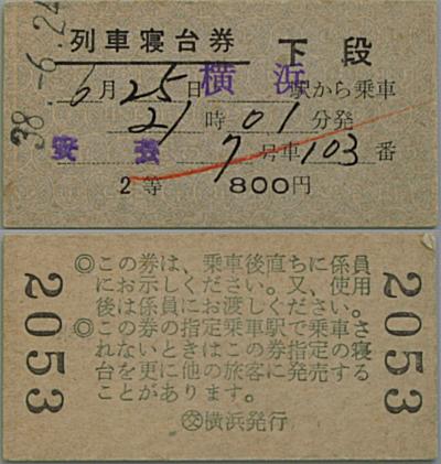 昭和38年6月24日の寝台券です。 これも発行は横浜駅ではなく(交)になっています。
