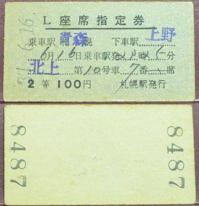 昭和37年6月16日の青森から上野までの座席指定券です。 L特急というのは知っていますが、L急行ってあったのでしょうか? 下の急行券と同じ日なので、「北上」っていうのは急行だと思うのですが。 下の切符は大雪丸発券ですが、これは札幌駅発券ですね。