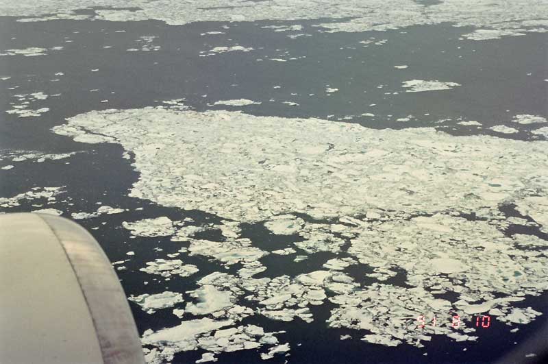 フェアバンクスを飛び立った飛行機はバロー空港へのアプローチをするときに北極海にでてターンします。その北極海の上空で海の様子を撮影しました。