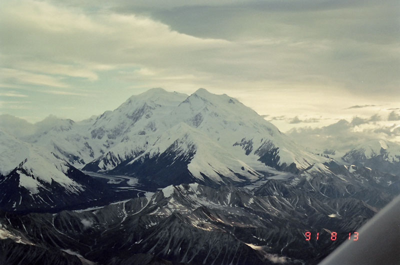 デナリ国立公園の名前の元となったデナリ山が見えてきました。 デナリ山はマッキンレィ山の別の呼び方です。山の麓は氷河の流れているのが見えます。