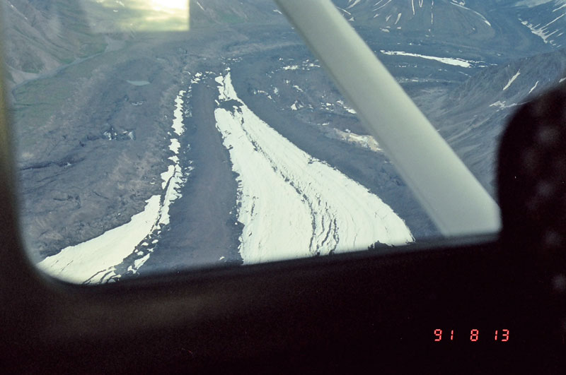 デナリ山の麓から流れる氷河をアップで撮影できました。流れと言っても目に見えて動いているわけではありません。