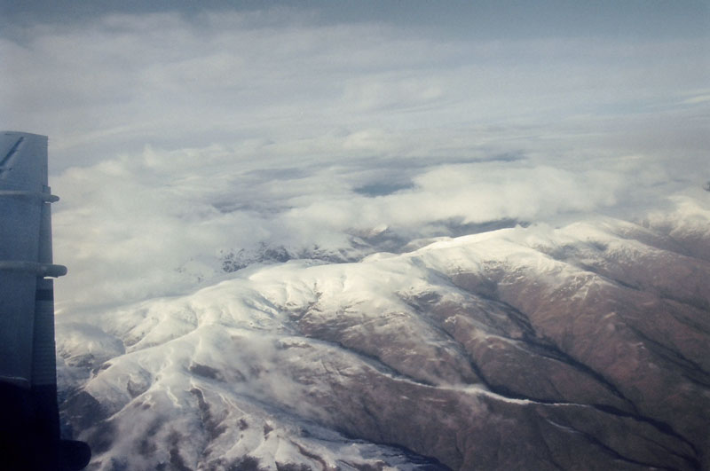 ニュージーランド旅行の時に南島から北島への移動は飛行機で、その機内からニュージーランドの雪を抱いた山脈が見えました。南半球なので冬なので当然ですね。