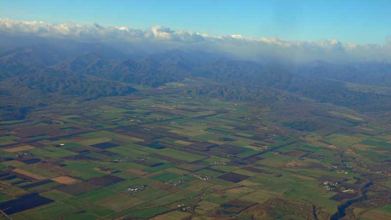 とかち帯広空港に向かって高度を下げている時に撮影した写真で日高山脈の標高が高い所は雪が積もっていて、その山脈の手前まで十勝の平原が広がっています。