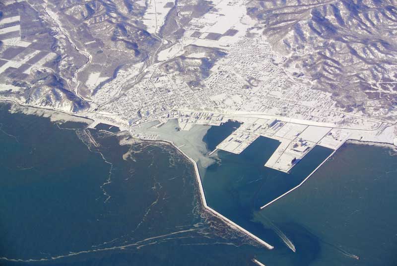 冬の十勝港上空からの撮影で港の防波堤による海流の変化なのか海の色が様々に変わっていて不思議です。