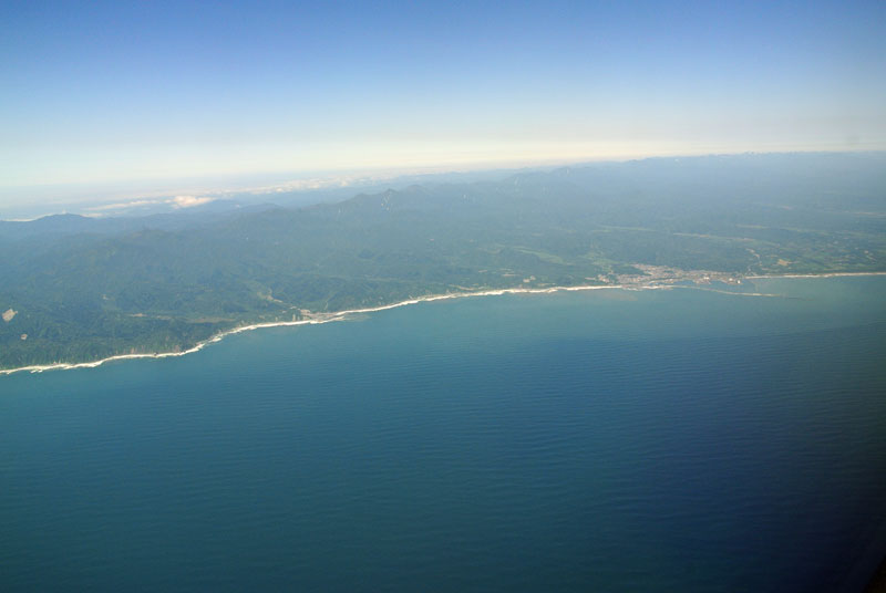 とかち帯広空港に近づくと襟裳岬の近くを飛行します。 この日は海岸線と平行に飛行したので十勝港とそこから続く黄金道路が良く見えました。