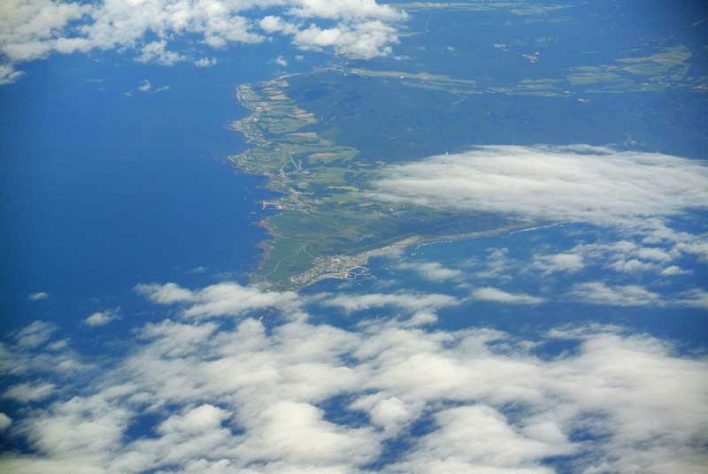 夏は湿度が高く空気が濁るのでなかなか地上が綺麗に見えませんがこの日は雲がありながらも何とか襟裳岬が確認できました。 でも肝心の岬の先端はちょうど雲がかかってしまいました。