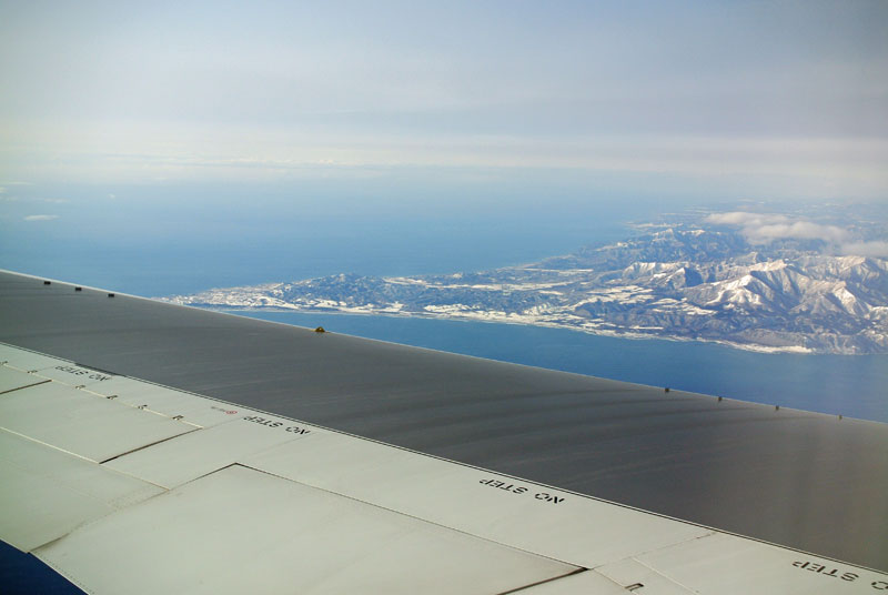 2013年の最初の襟裳岬で山は雪を抱いています。 今回は後部の席だったので翼越しです。