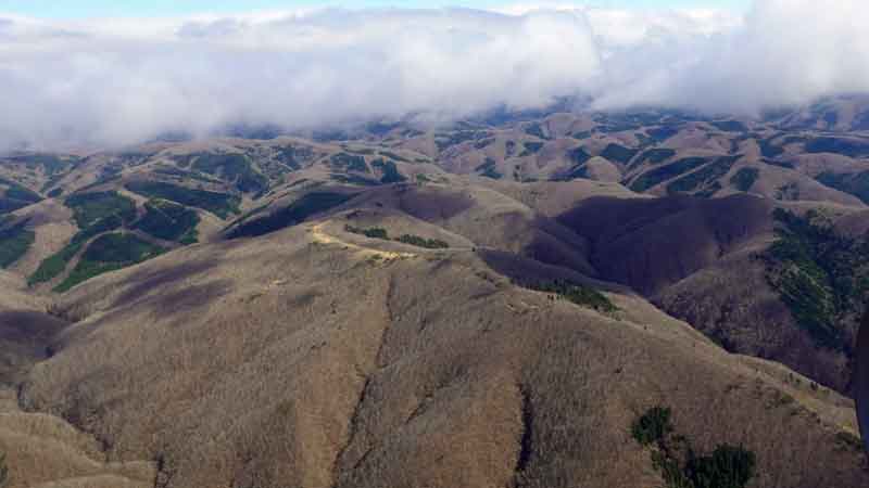 羽田からの便は北海道の東側から函館空港に向かって海岸線と並行に降下していきます。その降下の途中で右手に毛無山の付近が見えてきました。春の始まりなので茶色が多いですね。濃い緑は人工的に植林された常緑樹のスギ林のようです。