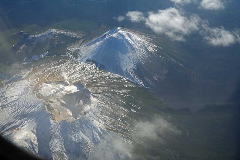 雪を抱いた山が二つ見えてきました。手前の火口が大きいのは雌阿寒岳で奥の形がスッキリしているのは阿寒富士です。