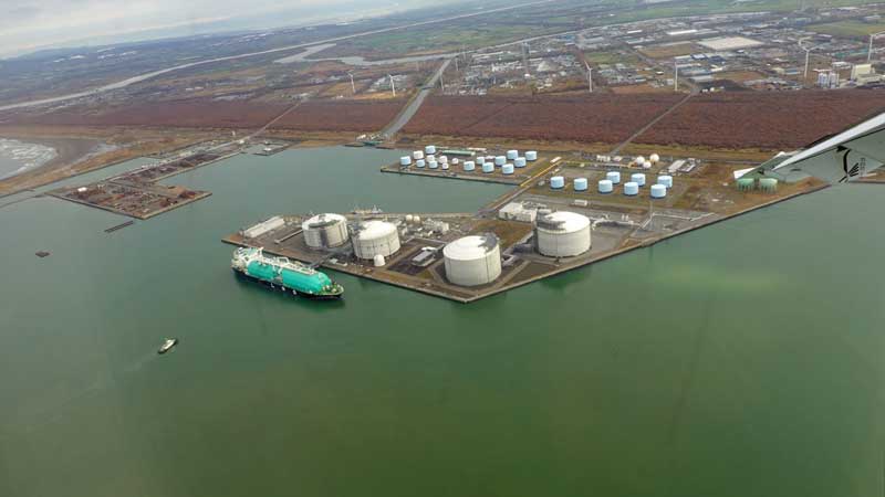 石狩湾新港のあるLNG基地を撮影しました。そのLNG基地に輸入した液化LNGを運んできたタンカーも見えます。