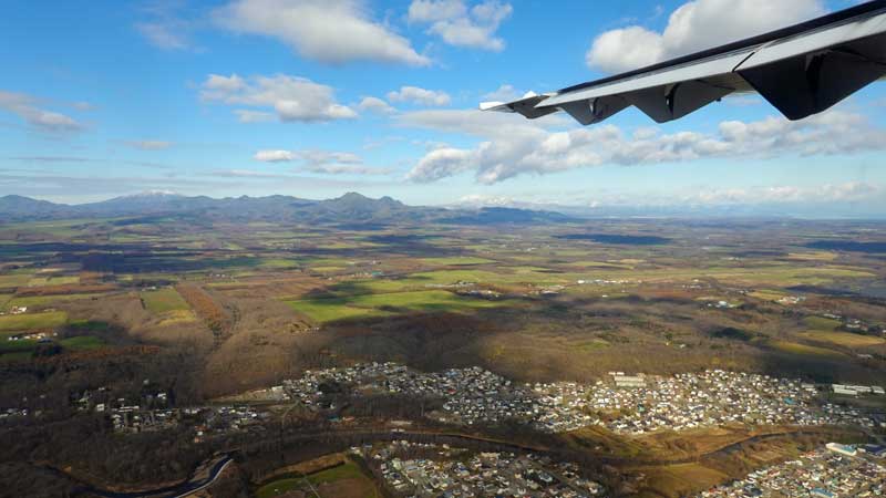 すぐ下の家が集中しているのは中標津の市街地で奥に見えるのが根室中標津空港です。西風なので一度東に飛行してUターンしての着陸なので空港も撮影できました。
