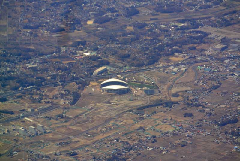 東北自動車道の横に特徴のある形の建物が見えます。 これはサイタマスタジアムですが、斜めから見ているので蛤のような形に見えます。