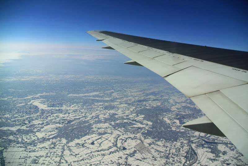 羽田を離陸して坂東太郎の呼び名もある利根川を越えたあたりでの撮影です。 前々日には関東地方は大雪で道路などが大混乱になったときで、雪の関東から大雪の北海道へのフライトです。