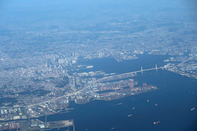 東京湾を飛行中にベイブリッジとそれに続く首都高速道路がクッキリと見えています。横浜港の客船ターミナルには大きな客船がいるのも見えます。