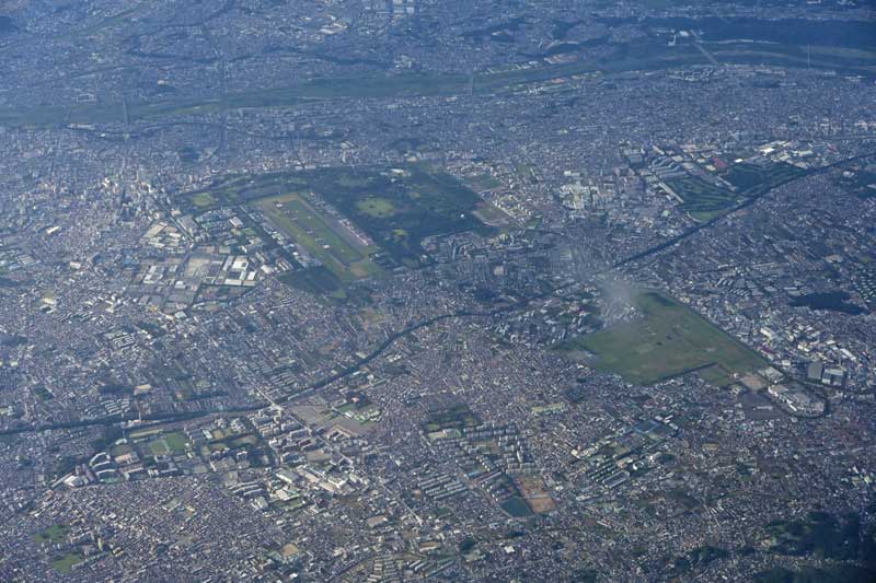 北側から南の方を撮影した写真で緑の大きなエリアが3っつ見えます。上の左側は滑走路が見えるので立川駐屯地でその隣は国営昭和記念公園です。右斜め下に見える広いエリアは昔の日産自動車村山工場の跡地で、いまは宗教法人の持ち物になっているようです。