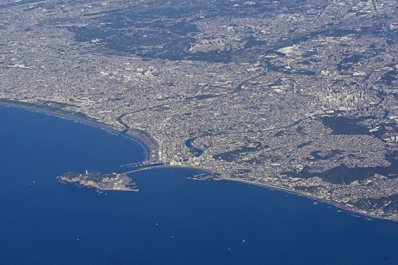 羽田空港を離陸して三浦半島を越えてから湘南海岸の風景が見えて来た所で江の島がクッキリと見えていました。
