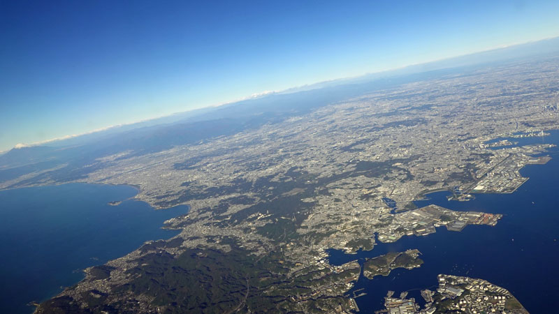 西に向かう飛行機は飛行ルートによっては三浦半島を横切ります。その時に撮影した写真で横須賀の海軍基地や八景島シーパラダイスなどが見え、左側には江の島から遠くには富士山が見えました。