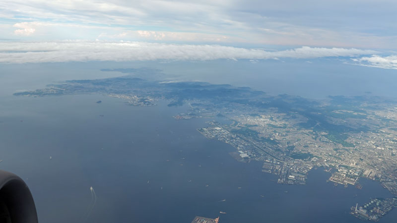 羽田空港を離陸して上昇しベイブリッジの横あたりを飛行中に撮影した写真で右の密集しているのが本牧からの沿岸部で奥は三浦半島です。