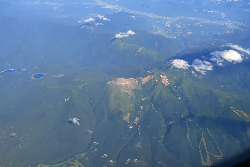 茶色っぽい那須岳の山頂が見えて来ました。その左側の丸い湖は沼原です。