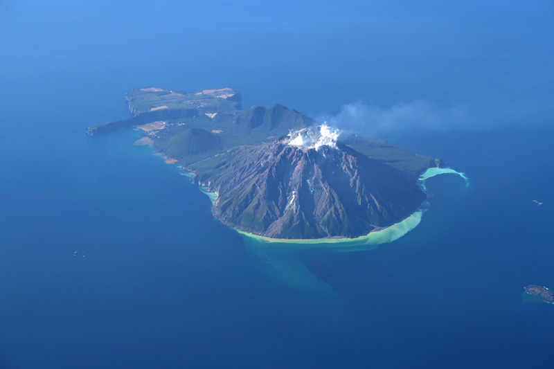 硫黄島は活火山の島で大きな火山が島の大きな面積を占めています。その火山が海に接する所の海の色が変わっていますが火山から流れ出た成分の盛況なのでしょうか? 知床の硫黄山から流れ出た川が海に注ぐところも同じような色をしていました。