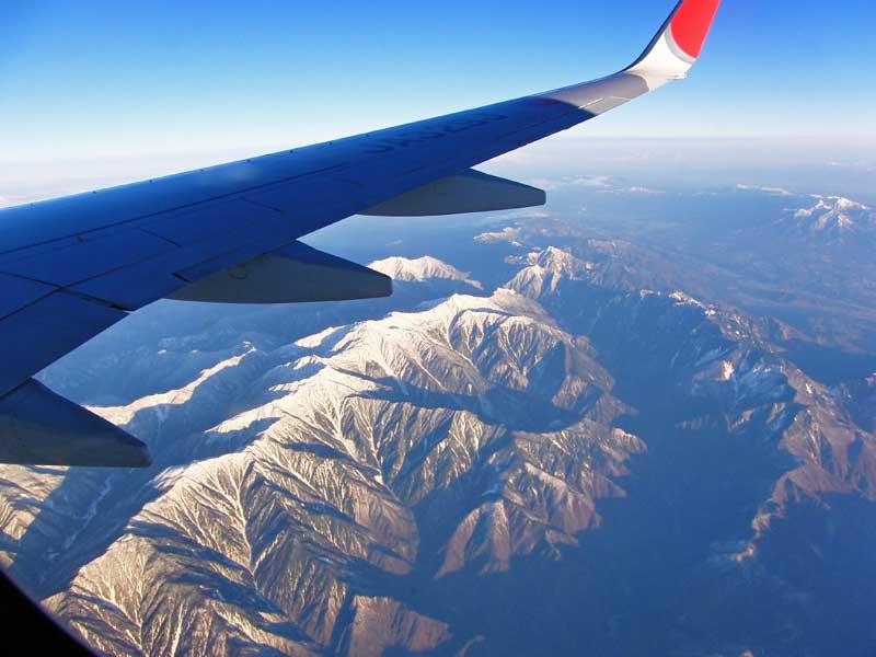 羽田から広島に向かう早朝のフライトで右側に雪を抱いた綺麗な山脈が見えてきました。 時間から推定すると弓のようになったくらい部分は広河原から続く川沿いの渓谷のようです。