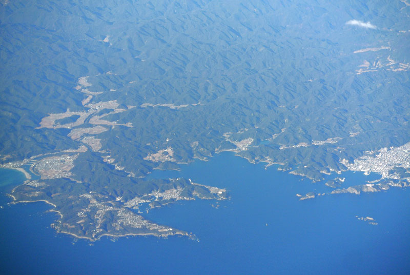 羽田から沖縄の便は渥美半島当たりから海上に出て紀伊半島と平行に進み沖縄を目指します。 紀伊半島に沿って飛んでいるときは紀伊半島の町が確認できます。