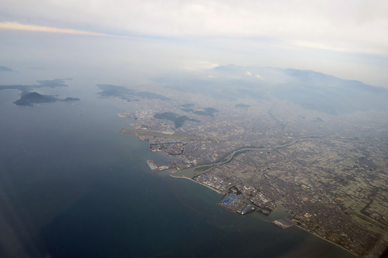 松山空港を離陸して海上でターンして陸地に入る所で撮影したもので、松山空港に重信川の河口が見えています。手前の海岸線には青い屋根の工場が見えます。