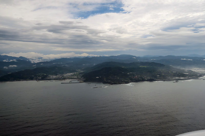高知竜馬空港に着陸するちょっと前に見えた海岸線の風景で、右側のこんもりと盛り上がっているのは手結岬です。