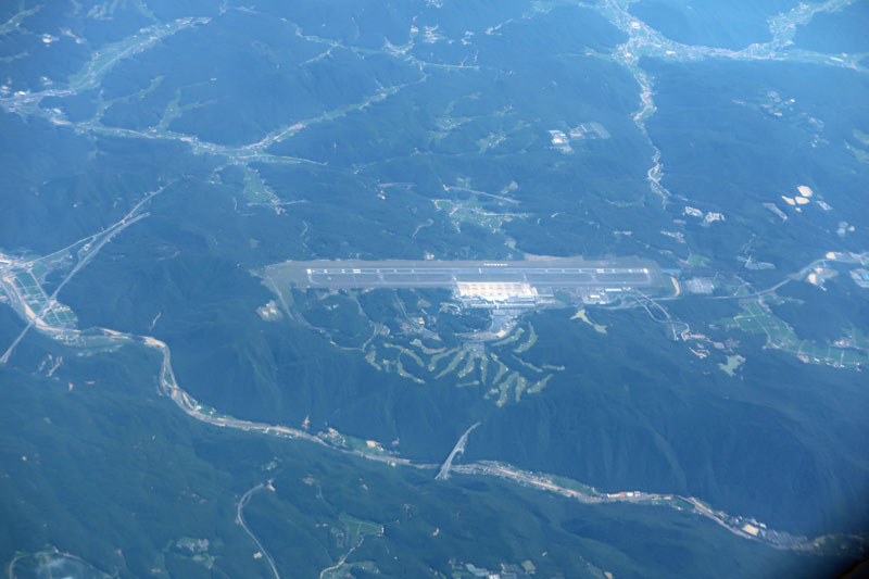 羽田から福岡空港への便は山陰と山陽のまん中の所を飛行します。その途中で広島空港が見えてきました。広島空港は海岸線の広島市からは遠い山の中にあります。