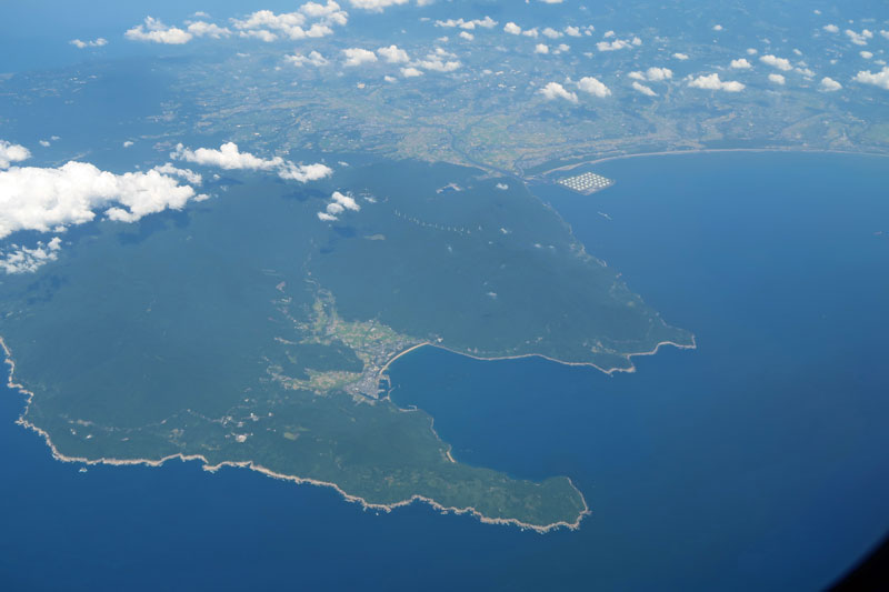 志布志湾の石油備蓄基地を見たすぐ後にある湾は内之浦で、下側の半島は火崎です。写真でその下側の半島から少し左に位置するのがJAXAの内之裏のロケット発射基地です。