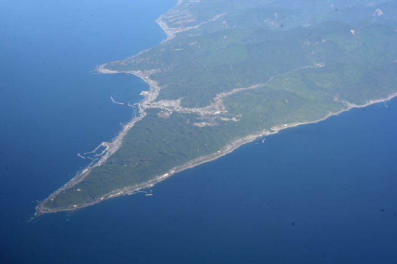 高知県の大きな岬の一つである室戸岬が見えてきました。 特徴のある三角の岬は先端近くまで山が迫り道路や町は海岸線に集中していますね。