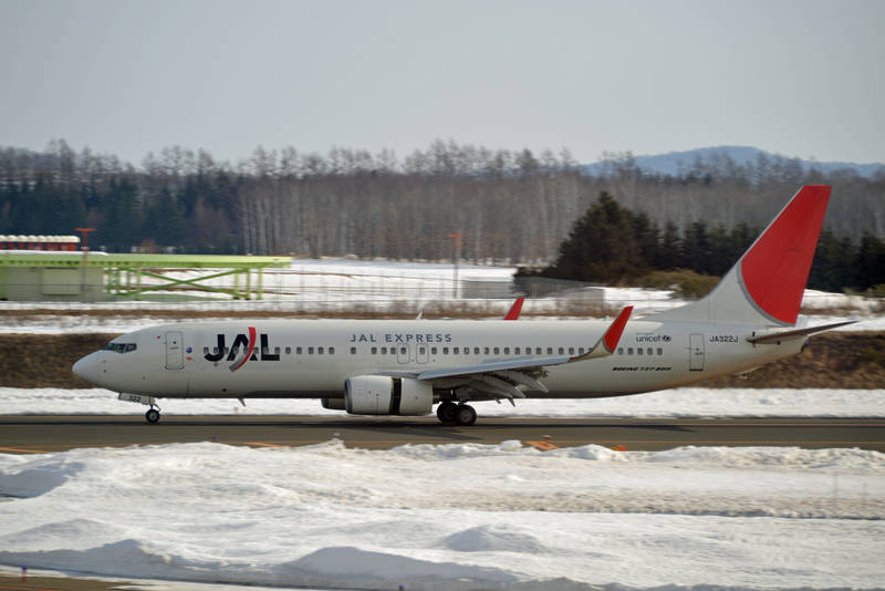 とかち帯広空港に羽田からの便が着陸して逆噴射をしているJAL Express機です。