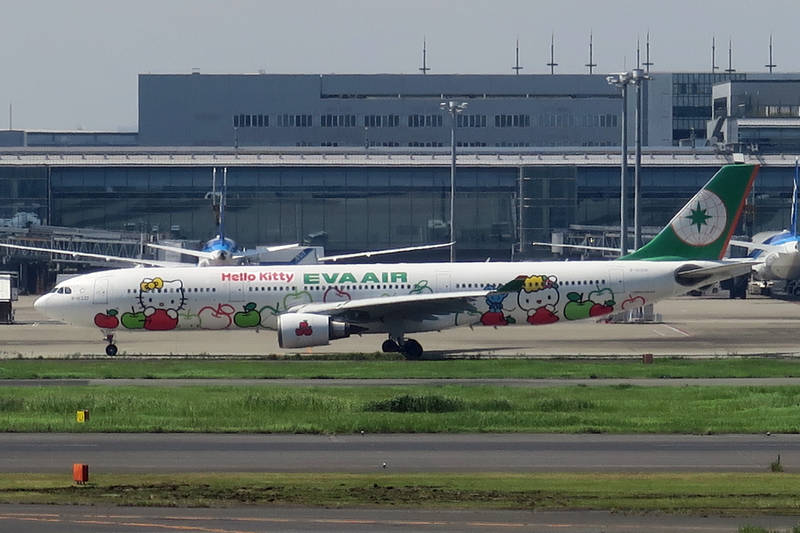 エバ航空のキティちゃんジェットが国際線ターミナル前を通過していきました。