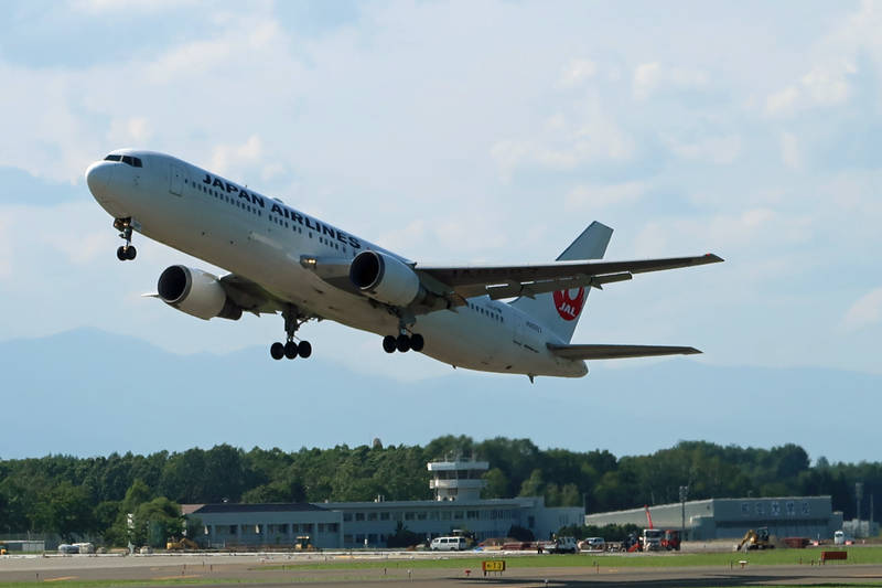 空港でターミナルとは反対側からJALの767の離陸シーン。夏なので遠くの日高山脈が少しだけ見える。