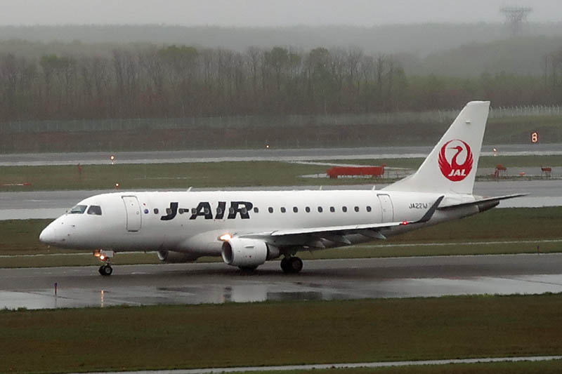 雨の新千歳空港でスポット前をJ-AIRの機材が移動していきました。