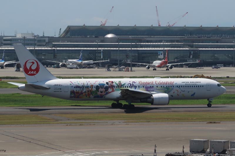 JALの東京ディズニーリゾート35周年記念の「セレブレーションエクスプレス」特別塗装の767が誘導路を離陸に向けて移動していきます。