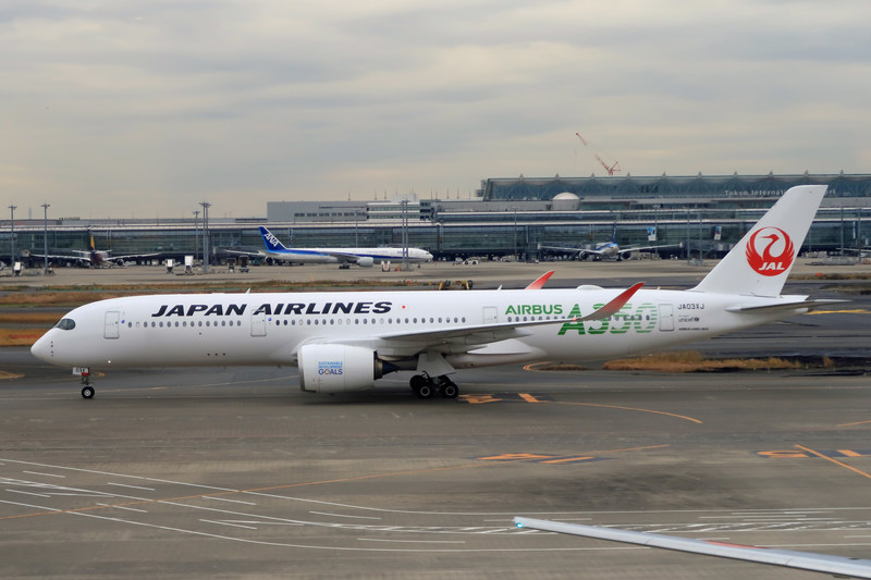 JALが導入したエアバス機の3号機で、ここまでが特別塗装になっています。 エンジンカバーにもSDGsのロゴが描かれています。
