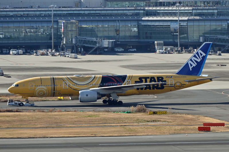 エンジン問題で飛べない日々が続いていた2022年からやっと飛べるようになったANAのスターウォーズジェットが国際線ターミナル前の誘導路を氣人されていきました。