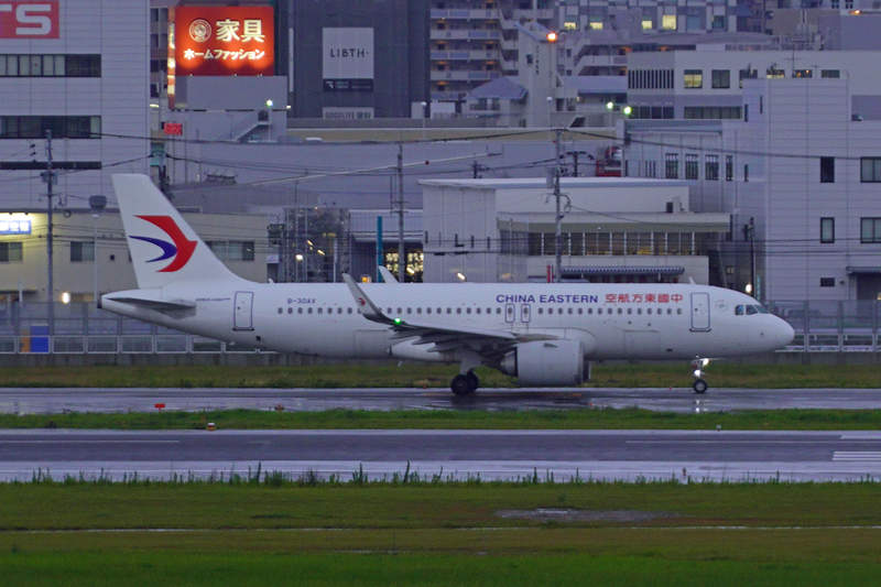 中国東方航空のエアバス機が国際ターミナル前の新誘導路を離陸のための移動していきます