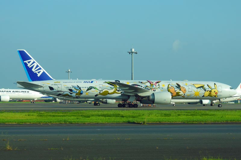 ANA協賛の「そらとぶピカチュウプロジェクト」の特別塗装機です。イーブイやシャワーズ・サンダース・ブースターが描かれています